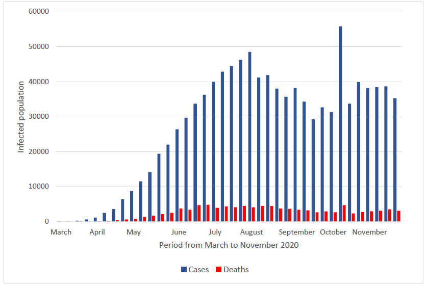The SARS-CoV-2 virus, associated with the COVID-19 disease, has produced a pandemic whose effects are not only limited to public health, but also have economic, political, and social consequences (Lazcano-Ponce and Alpuche-Aranda, 2020). As of January 30, 2020, Mexico began executing public health emergency preparedness and response plans, implementing lessons learned during the AH1N1 influenza pandemic of 2009 (Alpuche-Aranda, 2020). While the first case in the country was recorded on February 26, 2020, the first death associated with the disease occurred on March 19. Figure 1 shows the development of the COVID-19 pandemic in Mexico until November 2020.