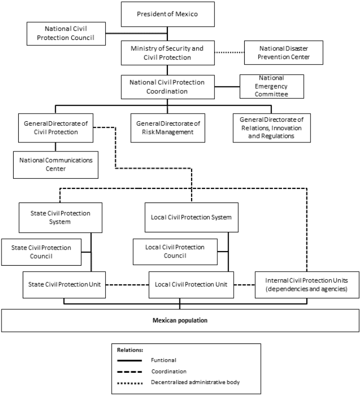 The coordination of SINAPROC changed in 2018, when the Ministry of Security and Civil Protection undertook this duty, shifting its focus from being an internal policy to becoming a public safety issue (Secretaría de Gobernación, 2018). The General Civil Protection Law (Secretaría de Gobernación, 2012) defines SINAPROC as an organic set of structures, functional relationships, norms, instances, instruments, policies, procedures, and actions which government agencies establish jointly with public sector entities; organizations of various voluntary, social, and private groups; federal and municipal entities, and Mexico City, in order to carry out coordinated actions regarding civil protection (Secretaría de Gobernación, 2012, article 14).
