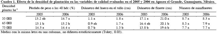 En los dos años estudiados (2005 y 2006) el diámetro de florete fue inversamente proporcional a la densidad de plantación, ya que a mayor densidad fue menor el diámetro (Cuadro 1). Este fenómeno también fue reportado por Chung (1982) y Damato (2000). Lo anterior es un aspecto positivo para las empresas procesadoras de brócoli, ya que requieren menor número de cortes para el procesamiento de floretes.