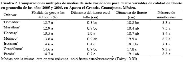 Tanto el diámetro de cabeza como el diámetro del hueco en el tallo fueron mayores (P ≤ 0.05) en los materiales cultivados en el 2006 que en el 2005 (Cuadro 1). Posiblemente la diferencia entre años se debe a que durante los meses cultivo (julio a septiembre) del 2006 la precipitación en la región fue de 138.3 mm mensuales, mientras que en los mismos meses del 2005 fue de 89.8 mm mensuales; es decir, la mayor precipitación del año 2006 pudo haber inducido un mayor desarrollo de las plantas, así como mayores diámetros de florete y de tallo hueco.