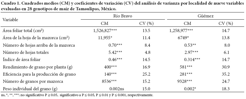 El análisis de varianza por localidades muestra que la respuesta de los genotipos de maíz fue significativamente diferente (P < 0.05) para todas las variables (Cuadro 1), excepto para peso individual de grano en Río Bravo. Esto indica la existencia de un alto grado de variabilidad genética susceptible de ser aprovechada en un programa de mejoramiento genético. Similares resultados han sido reportados por Grzesiak (2001), Hortelano et al. (2008), Pecina-Martínez et al. (2009), Idris y Abuali (2011), Pecina et al. (2011) y Hortelano et al. (2012), para diferentes variables en maíz.