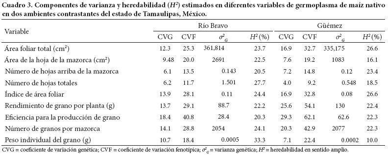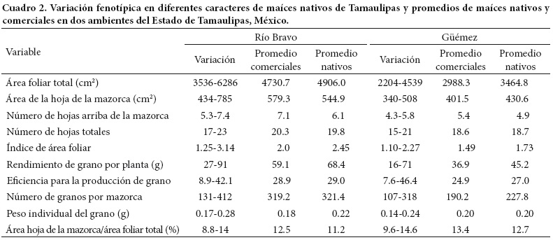 Los promedios para genotipos comerciales y nativos en cada variable y las variaciones en cada ambiente se muestran en el Cuadro 2. La diversidad mostrada por los maíces nativos en las variables en estudio indica que la selección para caracteres como área foliar total y área de la hoja de la mazorca puede ser efectiva, aunque lo que resulte estará en función de la magnitud de la heredabilidad (Johnson et al., 1955). En el ambiente con alta temperatura (Güémez), todas las variables tuvieron valores más bajos en comparación con el comportamiento manifestado en la localidad con temperatura óptima (Río Bravo).