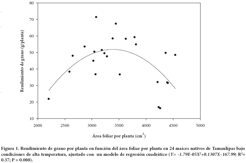 Los datos fueron sometidos a un análisis de componentes de varianza (SAS Institute, 2010) por localidad, y se calculó la heredabilidad en sentido amplio (H2) para cada una de las variables en estudio. Los componentes de varianza y H2 se determinaron con el procedimiento usado por Johnson et al. (1955) para cada una de las localidades. Los componentes obtenidos en Güémez se compararon con los obtenidos en Río Bravo, considerando el efecto de la alta temperatura (temperaturas > 35 °C). La comparación de medias entre tratamientos se hizo con la prueba de Tukey (P < 0.05). La asociación entre variables se determinó mediante correlaciones de Pearson (P < 0.05). La relación entre el rendimiento de grano por planta y el área foliar total fue analizada con un modelo de regresión cuadrática con el PROC REG de SAS.