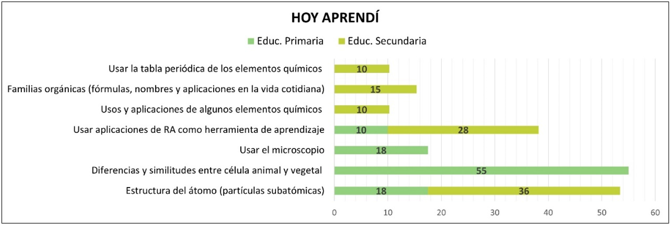 Respecto a la consulta realizada a alumnos de ambos niveles educativos, ¿Qué aprendiste durante el taller?, se distingue que el 55% de los estudiantes de primaria expresan las diferencias y similitudes entre célula animal y vegetal, seguido por el 36% de estudiantes de secundaria que nombran la estructura del átomo y, finalmente, el 28% de estudiantes de secundaria frente a un 10% de estudiantes de primaria, que mencionan el uso de las Apps de RA como herramienta de aprendizaje (Gráfico 1).