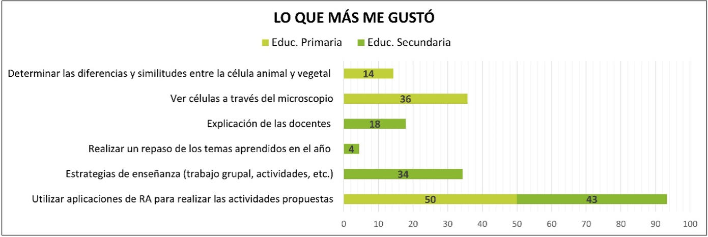 En cuanto a la pregunta ¿Qué te gustó más de lo realizado en este taller? Se destaca que el 50% de los estudiantes de primaria manifiestan que les gustó utilizar Apps de RA en las actividades propuestas, mientras que para los alumnos de secundaria este porcentaje se reduce al 43%. Otros valores interesantes a resaltar son, el 36% de alumnos de primaria que dicen haber disfrutado de la observación de las células a través del microscopio y el 34 % alumnos de secundaria que hacen énfasis en la metodología de enseñanza (Gráfico 2). Esto muestra la motivación e interés surgido en los estudiantes al abordar las temáticas seleccionadas, mediante el uso de las Apps de RA. Seguidamente, se comparte algunas apreciaciones de los estudiantes:
