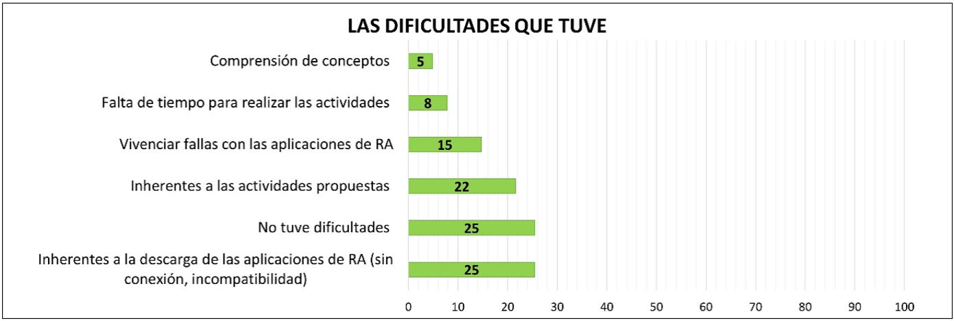 Asimismo, cabe resaltar que el 22% de los estudiantes nombran dificultades inherentes a las actividades propuestas como, por ejemplo, inconvenientes en el cálculo del número de electrones en las diferentes órbitas del modelo atómico de Bohr, o bien, la determinación de las similitudes y diferencias entre célula animal y vegetal (Gráfico 3).
