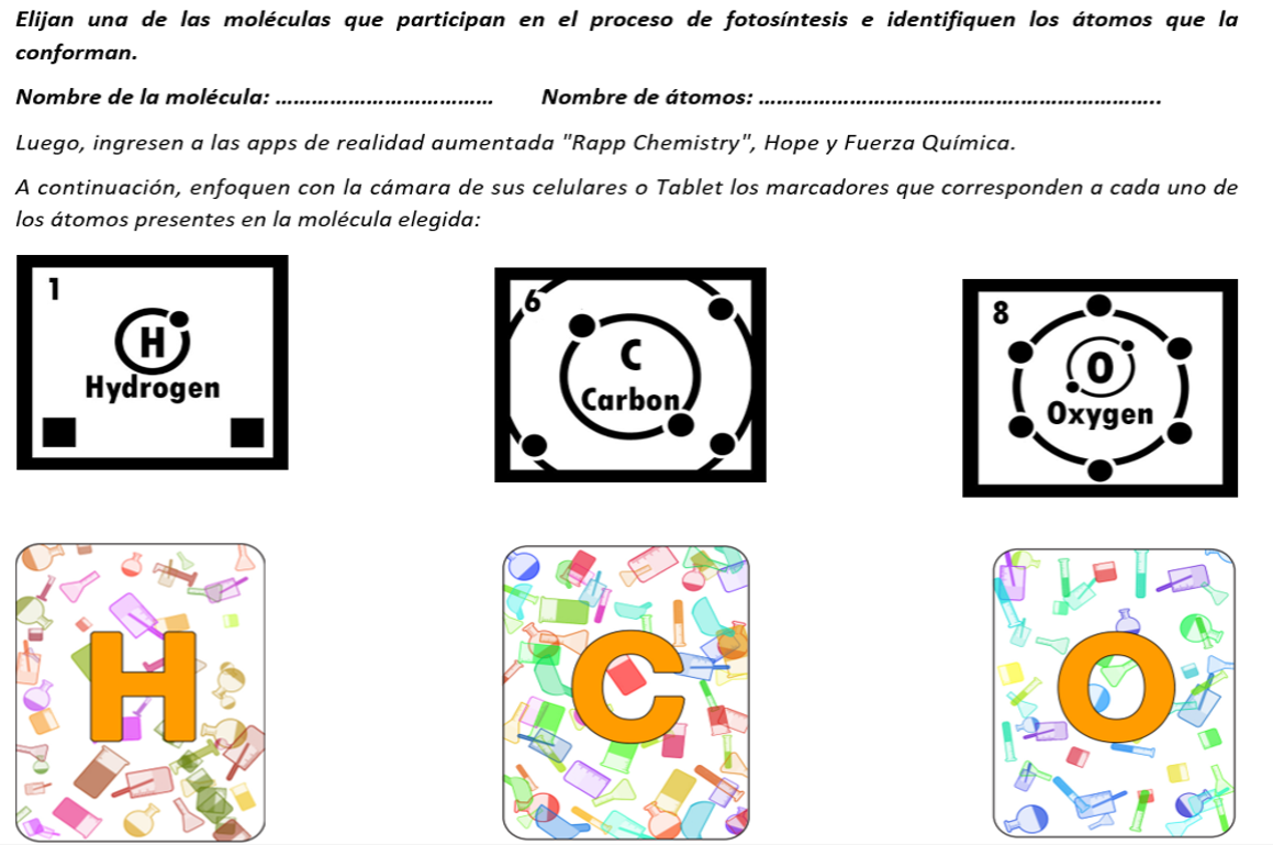 Imagen 4 Actividad de exploración y desarrollo que involucra el uso de marcadores de las Apps “RApp Chemistry” y “Fuerza Química”.