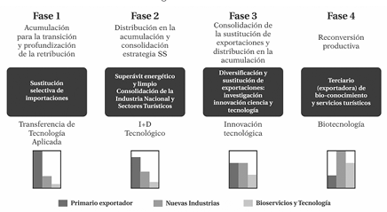 | Régimen político y perspectiva de desarrollo | Dictadura nacionalista / desarrollismo e isi | Retorno a la democracia / efecto péndulo (desarrollismo -neoliberalismo) | Inestabilidad política / neoliberalismo | Transición al posneoliberalismo / boom de los commodities | Posneoliberalismo y buen vivir como alternativa postdesarrollista | Crisis política y neoliberalismo | ||||