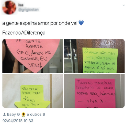 Created by fans after the end of Malhação: Viva a Diferença, in April 2018, the campaign #FazendoADiferença (#MakingADifference) aimed to take the main themes of the season to the walls of schools and colleges. To that end, the fandom selected quotes from songs about love and diversity featured in the plot’s soundtrack and transcribed them to post-its. Inspired by street posters, fans stuck the post-its in spaces where many students circulated, such as bulletin boards and bathrooms. In addition to sharing pictures of the #FazendoADiferença action, interacting viewers highlighted how small actions could contribute to a greater cause.