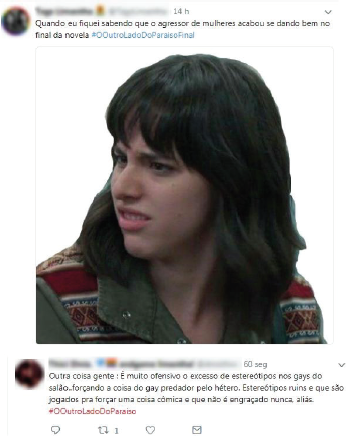 In addition to curating through Twitter threads with links to download episodes (Drive and Torrent) and scenes from series featuring LGBTQIAP+ characters, such as Skam France (France TV Slash/RTBF Audio, 2018-current), Wynonna Earp (Syfy, 2016-current) and Atypical (Netflix, 2017-2021), fans reflected representativeness of these communities in Rede Globo telenovelas. For example, during The Other Side of Paradise (2017-2018), which aired on the 9:00 PM time slot, the fandom questioned the perpetuation of stereotypes in the plot. Tweets drew attention to the negative caricature of gay characters and the unfolding of the narrative arc involving violence against women. According to fans, despite assaulting his wife Clara (Bianca Bin) throughout the chapters, Gael (Sergio Guizé) had a happy ending, not suffering any repression for his actions.