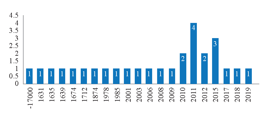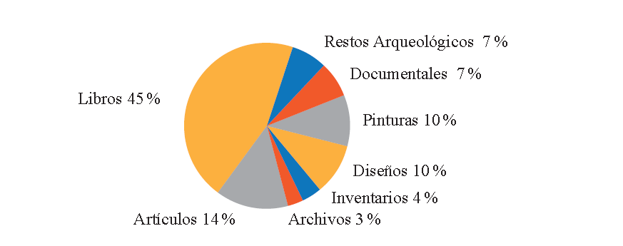 Para la redacción de este artículo se han tratado un total de 31 fuentes distintas, divididas en un resto arqueológico, dos series documentales, tres pinturas, un dibujo, un documento de archivo, 18 libros y cinco artículos que se reflejan en la Figura 1. También las fechas de las fuentes usadas responden al análisis en tiempo profundo que requiere la arqueología de medios. En la Figura 2 se clasifican por año un total de cinco fuentes del siglo xvii, una fuente del XIX, cuatro del siglo XX y 25 del XXI.
