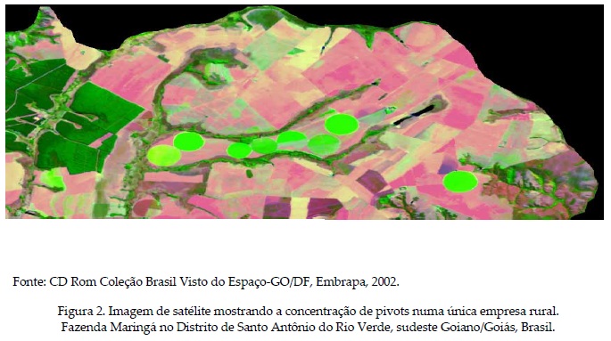 Thomaz Júnior (1996), salienta as leituras diferenciadas realizadas pelo capital e pelo trabalho sobre os fenômenos no território e as diferentes manifestações desse conflito. A leitura do território não deve ser unilateral, pois capital e trabalho fazem leituras distintas sobre o mesmo fenômeno, uma vez que o trabalho encontra-se subsumido ao capital. As paisagens rurais, especificamente nas áreas de Cerrado estão ocupadas com extensas lavouras de soja, milho, algodão, trigo, café etc., além de pastagens para o criatório. Atualmente, baseando-se em informações dos empresários rurais e em imagens de satélites, estima-se em cerca de 50 o número de pivots, apenas nas áreas de chapada de Santo Antônio do Rio Verde no município de Catalão, como a imagem de satélite, de uma empresa rural (Figura 2), mostrando a aceleração no processo de incorporação dessas áreas ao circuito produtivo. Calcula-se que irrigam uma área de aproximadamente 8 000 ha, denotando intensa utilização dos recursos hídricos3 de forma inadequada e sem qualquer controle.