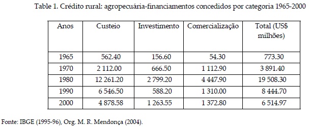 A adoção de políticas públicas para a ocupação racional e indiscriminada das áreas de Cerrado através do Sistema Nacional de Crédito Rural (SNCR; Tabela 1), forneceu as bases materiais para o crescimento econômico, viabilizando a internalização da agricultura aos setores industriais à montante (insumos, implementos etc.) e à jusante (indústrias processadoras).