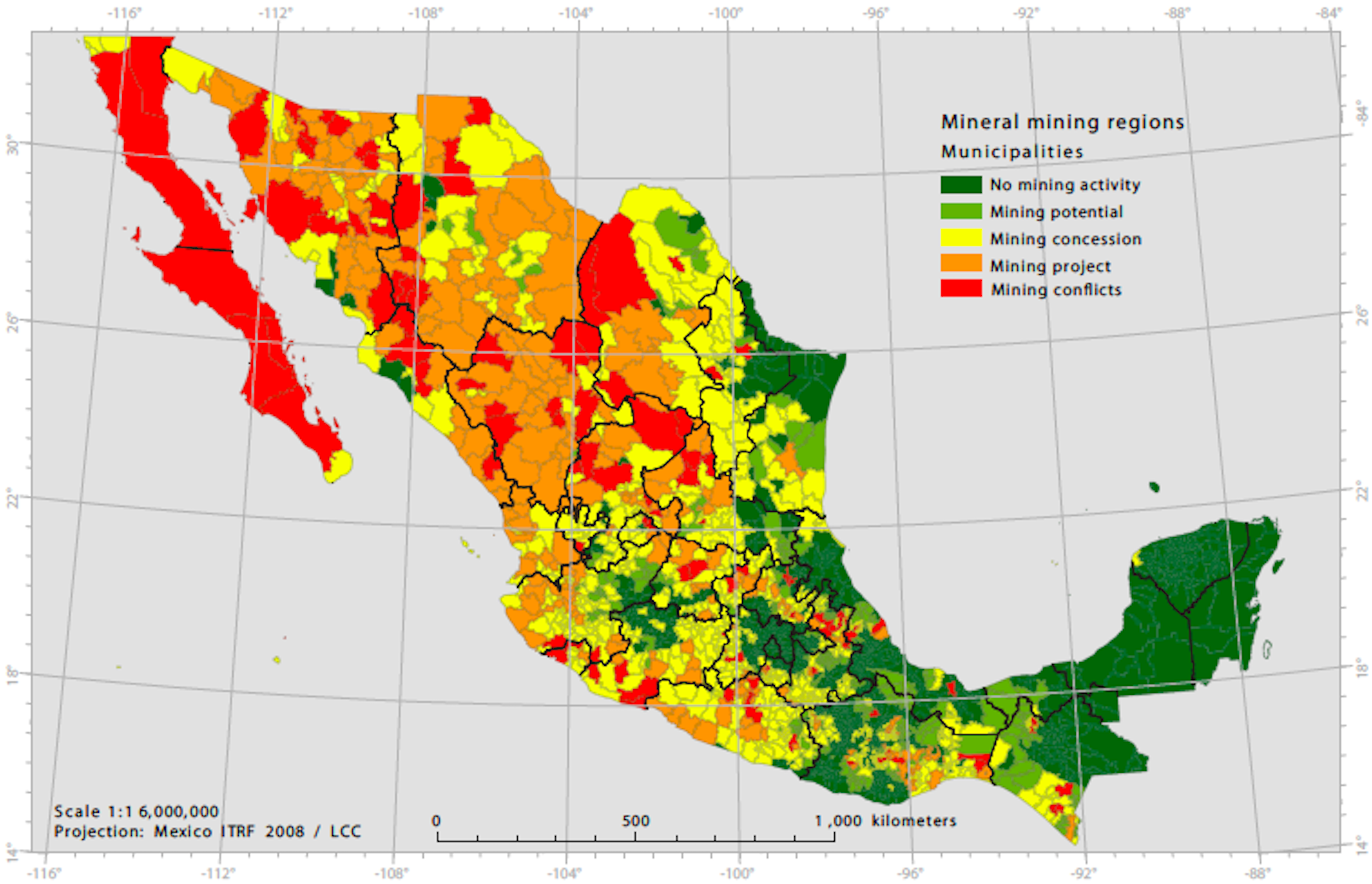 | Metal mining activities | Mining potential Mineralized Regions of the Mexican Geological Service Mining concessions. Mining cadastre of the Board of Economy Mining projects. Database of the Mexican Geological Survey. Main mining projects in Mexico Mining conflicts. Conversando con Goliath project database: participation, mobilization, and repression around neo-extractive versus environmental conflicts |