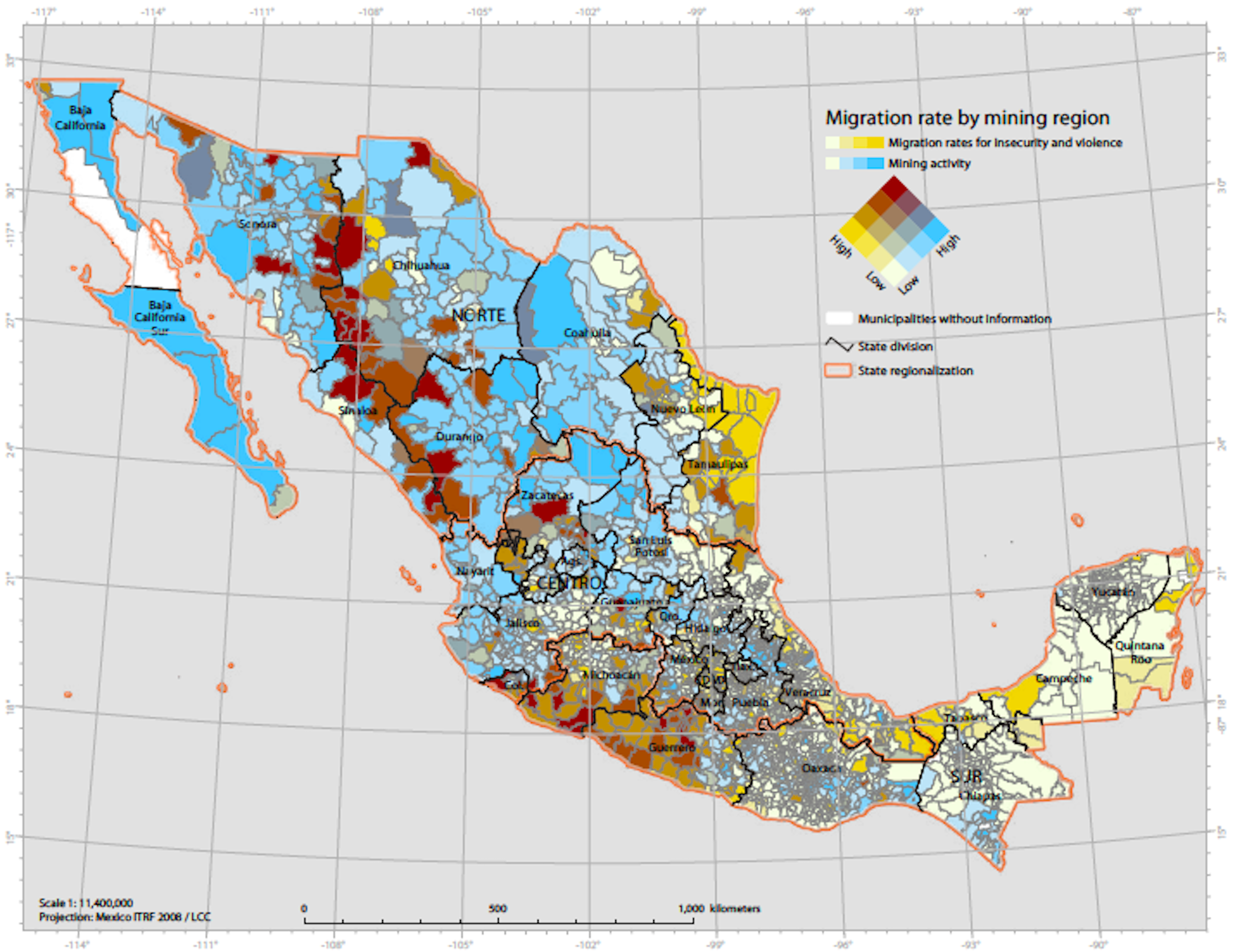 For this reason, we explored the relationship between some violence indicators, particularly high-impact crimes, and high emigration rates. This relationship seems a suitable approach for identifying forced internal displacement (FID). From this first approximation to the phenomenon, we associated the FID with different mining exploitation phases throughout the Mexican territory (exploration, production, development, postponement, closure). This relationship was analyzed from a regional perspective to demonstrate the correlation between both territorial dynamics. This methodological procedure allowed us to identify the differences between these regions according to the type of mining activity and the incidence of FID. Our work hypothesis is that there is a link between forced internal displacement and violence (high-impact crime) in the territories where mining corporations are located and that this relationship occurs in a differential way according to the metal mining production phase.