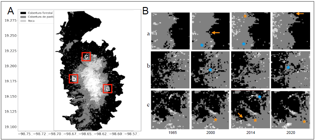 Figura 1 Clasificación de la cobertura vegetal y mapas de cambio. A) Ejemplo de clasificación supervisada según los tipos de vegetación para el 2020. Se observan tres categorías de cobertura: forestal, pastizal y roca. B) Detalles de cambio en tres cuadros, se observan cambios en la línea de árboles de 1985 a 2020, tales como aumento de la densidad (asterisco naranja) o la disminución de la densidad (asterisco azul) y el avance de la línea de árboles (flecha naranja).