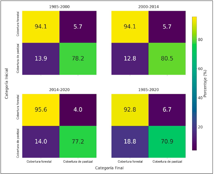 Figura 2 Matrices de transición de cobertura vegetal. Se observan las matrices de transición para los periodos analizados: 1985 a 2000, 2000 a 2014, 2014 a 2020 y 1985 a 2020. Cada matriz muestra el porcentaje de píxeles que cambiaron de categoría (cobertura forestal o pastizal) entre los años comparados. Los valores representan las transiciones entre las dos categorías disponibles, donde la escala de color indica la intensidad de las transiciones.
