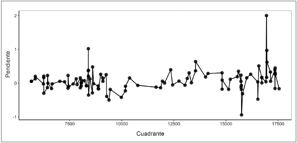 Observamos tanto avances como retrocesos en la línea de árboles, con predominio del aumento en altitud. La magnitud del avance de la línea de árboles fue generalmente pequeña. De los 155 cuadros evaluados, el 60% presentaron pendientes positivas en sus respectivos modelos de regresión lineal, lo que sugiere un avance de la línea de árboles durante todo el periodo. De este 60%, cerca de la mitad presentaron pendientes menores a 0.1, lo que indica que el aumento altitudinal fue sutil. Solo en tres casos se observaron pendientes cercanas o superiores a 1, lo que refleja un avance más significativo de la línea de árboles en esos cuadrantes. En el 40% de los cuadros con pendientes negativas, ninguna pendiente alcanzó un valor de -1, sugiriendo que los retrocesos altitudinales también fueron sutiles (Fig. 3).