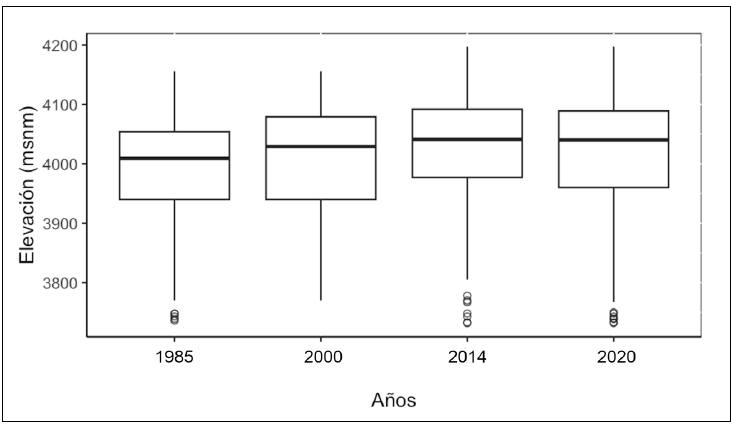 La altitud promedio de los cuadros utilizados para la detección del avance de la línea de árboles presentó un incremento desde 1985 hasta 2014, seguido de una estabilización en el último periodo. Entre 1985 y 2000 se registró un aumento en la media de la altitud límite de los árboles de 20 m, mientras que entre 2000 y 2014 el incremento fue de 12 metros, y para el año 2020 se observó una disminución de 1 metro. También se identificó un aumento en la altitud mínima durante el primer periodo; entre 1985 y 2000 el valor mínimo se incrementó en 34 metros, aunque disminuyó en 38 metros hacia 2014, manteniéndose sin cambios en 2020. Los valores de altitud máxima llegaron a los 4200 metros, lo cual no coincide con las observaciones de campo en los que establecen el límite del bosque continuo (timberline) a los 4000 metros (Fig. 4). Esta discrepancia podría deberse a que los datos satelitales están captando parches discontinuos de árboles (treeline) en altitudes superiores, los cuales también pueden observarse actualmente en campo incluso hasta los 4300 metros.
