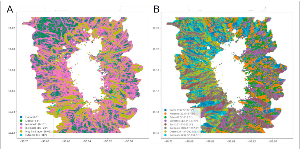 La pendiente es otro factor relevante que también ha mostrado tener un efecto en el avance de la línea de árboles debido a que influye en el microclima, la humedad del suelo y la exposición al viento, que as u vez pueden afectar el establecimiento y crecimiento de los árboles (Zheng et al., 2021). Estudios anteriores han sugerido que las pendientes moderadas (15°-25°) son óptimas para el crecimiento de P. hartwegii, mientras que las pendientes más pronunciadas (>35°) limitan el establecimiento por la inestabilidad del terreno y la falta de suelo desarrollado (Torres-Beltrán et al., 2017). Por otro lado, se ha documentado que las pendientes suaves retienen mejor la humedad del suelo, facilitando el desarrollo inicial de los árboles jóvenes (Astudillo-Sánchez et al., 2019). Y a su vez, también se ha observado que en los bosques de la línea de árboles estable tiende a ubicarse en pendientes más pronunciadas, donde la capacidad de acumulación de agua derivada de la escorrentía favorece su crecimiento (Xu et al., 2020). En nuestro estudio, encontramos evidencia de avance de la línea de árboles en una amplia gama de pendientes, predominando en micrositios con pendientes llanas y ligeras, pero también ocurriendo en pendientes muy inclinadas y extremas.
