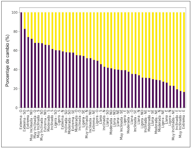 En el área de estudio predominan las pendientes inclinadas, seguidas de las moderadas y muy inclinadas. En contraste, se observa una menor cantidad de pixeles clasificados como llanos o de pendientes extremas (Fig. 5A). En cuanto a los pixeles de transición, encontramos que cambios de cobertura de bosque a cobertura de pastizal y de cobertura de pastizal a cobertura de bosque) pueden ocurrir dentro de la misma categoría, aunque también se observó una tendencia hacia un tipo de cambio específico (Fig. 6). Por ejemplo, en pendientes extremas con orientación oeste, categoría con el menor número de pixeles, el 100% de los cambios correspondió a la transición de cobertura de bosque a cobertura de pastizal (Fig. 6).