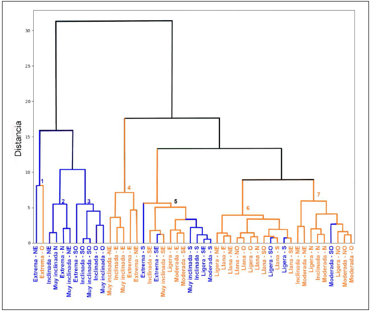 Figura 7 Dendrograma de las 48 categorías combinadas de pendiente y orientación, agrupadas según variables ambientales (Temperatura, SMI, Radiación y NDVI). El color de las categorías destaca el tipo de cambio predominante: en azul, transición de cobertura forestal a pastizal; en naranja, de pastizal a forestal. Cada grupo está marcado con un número (generado automáticamente por el análisis), cuyo color refleja la tendencia principal de ese cluster. En casos como el grupo 5 (negro), el color neutro indica ausencia de una dirección de cambio clara. Las líneas del dendrograma también siguen el patrón de color.