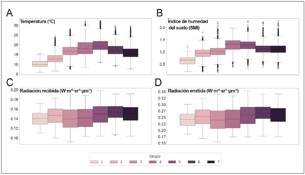 Figura 8 Distribución por agrupaciones de (A) temperatura superficial (°C), (B) índice de humedad del suelo (SMI), (C) radiación solar recibida (W·m⁻²·sr⁻¹·µm⁻¹), y (D) radiación emitida (W·m⁻²·sr⁻¹·µm⁻¹). Cada diagrama de caja muestra la media (línea central), rango intercuartílico (caja), valores extremos (bigotes) y outliers (puntos). Los colores distinguen las siete agrupaciones según se indica en la leyenda.