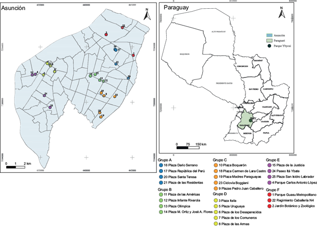 El clima en los sitios de estudio según la clasificación de Thornthwaite (Benítez y Antola 2020), es tropical subhúmedo. Las campañas de muestreo se realizaron entre los meses de octubre del 2020 y febrero de 2021 (Fig. 1). En este periodo las temperaturas medias rondaron en 27 ºC, con precipitaciones entre 354 y 71 mm y con humedad relativa del 51 al 75 %. Considerando que las lluvias pueden afectar el proceso de acumulación de metales y sustancias salinas (Figueira et al. 2002, Adamo et al. 2003), en caso de eventos lluviosos de acuerdo con el cronograma de trabajo establecido se consideró colectar tres días después de precipitaciones de baja intensidad (Figueira et al. 2002) y una semana después para tormentas o lluvias intensas de duraciones prolongadas. Se colectaron muestras de líquenes en 25 sitios urbanos, distribuidos en 17 barrios en las áreas verdes de Asunción y un Parque Nacional. Los sitios urbanos seleccionados presentaron en común áreas verdes, con alta concurrencia de vehículos y personas, alta densidad de viviendas y zonas comerciales a su alrededor (Fig. 2).
