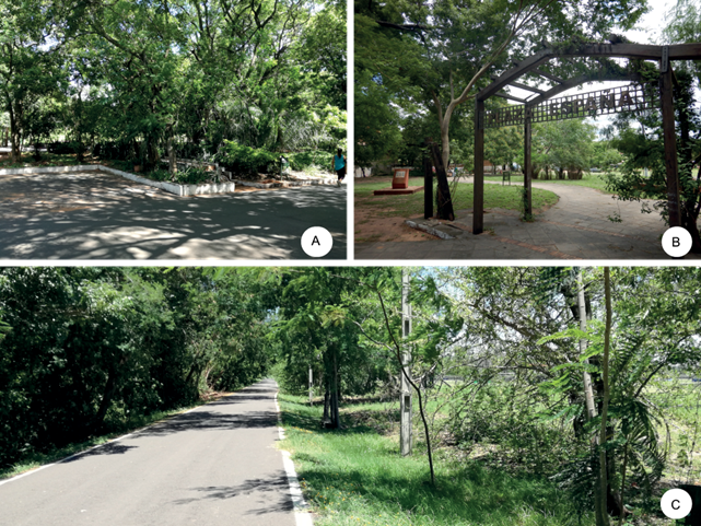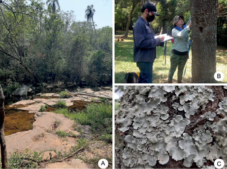 El Parque Nacional Ybycuí (PNY) ubicado a una distancia aproximada de 150 km de Asunción fue seleccionado como sitio testigo, por el tamaño de la superficie, cobertura arbórea y estado de conservación (Fig. 3). En el periodo de colecta se registraron temperaturas medias alrededor de los 26.1 ºC, con precipitaciones alrededor de 56 mm y con humedad relativa del 56.5 % (DINAC 2022). Se destaca al género Parmotrema por su alta ocurrencia en la mayoría de las áreas verdes seleccionadas por lo que se colectaron talos completos de tamaños similares desde 1.5 m de altura respecto al suelo para evitar contaminación terrícola (Bargagli y Nimis 2002) y como límite superior los 2 m. Las colectas se llevaron a cabo en las zonas periféricas de todas las áreas verdes mencionadas teniendo en cuenta la distancia a las calles principales. Los árboles muestreados fueron tajy (Handroanthus heptaphyllus), yvyra pytã (Peltophorum dubium), chivato (Delonix regia), yvyraró (Pterogyne nitens), mango (Mangifera indica), palmera (Roystonea sp.) y mbokaja (Acrocomia aculeata). La extracción del material liquénico se realizó con cuchillos de acero inoxidable para desprender del sustrato (Adler 1989, Estrabou 1999). Las muestras se depositaron en bolsas de papel madera previamente etiquetadas con la fecha, el lugar y características generales presentes en cada ejemplar.