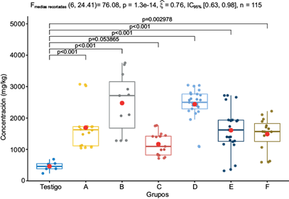 La prueba de Levene mostró varianzas heterocedásticas (F = 2.87; p = 0.012) y la prueba de Andeva arrojó resultados significativos (F = 76.08; p < 0.001), con un tamaño de efecto muy elevado (ξ = 0.76), reconociendo la existencia de algunos grupos que difieren en la concentración media.