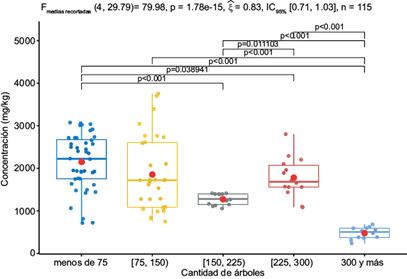 Fig. 5 Comparación entre los niveles de concentración de azufre por cantidad de árboles. Fmedias recortadas: estadístico F de la Prueba Andeva heterocedástica; p: valor p de la prueba Andeva heterocedástica; : tamaño de efecto de la prueba Andeva; IC: intervalo de confianza del tamaño de efecto; n: tamaño total de la muestra considerado en la prueba Andeva.