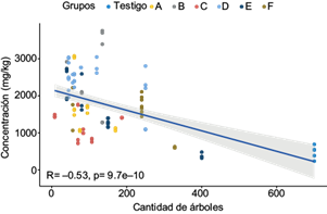 Para relacionar algunas características de las áreas verdes con la capacidad de amortiguar los efectos de la contaminación ambiental, se consideró la cantidad de árboles presente en cada sitio como un factor adicional de comparación. Se llevó a cabo un análisis de correlación de Pearson entre la concentración de azufre y la cantidad total de árboles. Mientras que para el Andeva se consideraron cinco rangos para la cantidad de árboles. Las agrupaciones tomadas fueron: menos de 75, [75-150), [150-225), [225-300), 300 y más. Tanto el análisis descriptivo como el inferencial fueron realizados empleando el programa estadístico R (R Core Team 2022).