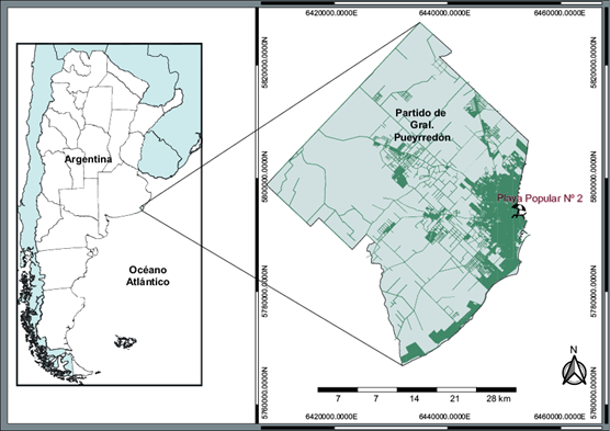 El presente estudio se llevó a cabo en una playa recreativa de la ciudad de Mar del Plata, Partido de General Pueyrredón, Provincia de Buenos Aires, Argentina.