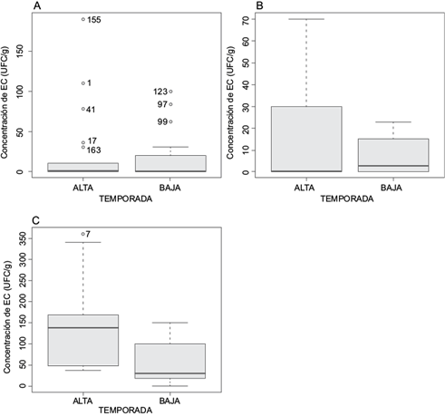 Fig. 2 Variabilidad de las concentraciones de Escherichia coli (EC) con sus respectivos límites máximos y mínimos en arena seca (A), húmeda(B) y agua de mar (C) de Playa Popular según temporada.