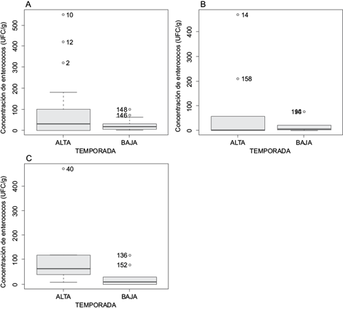 En tanto, los valores de concentración de las colonias del grupo de los enterococos determinados en cada uno de los periodos no presentaron diferencias significativas al comparar sus medianas (p > 0.05), al igual que los recuentos determinados en los sitios seleccionados para este estudio (Fig. 3).
