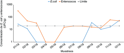 Fig. 5 Concentración y distribución de enterococos y Escherichia coli durante el muestreo 2018 medidos en unidades formadoras de colonia (UFC)/gramos, en arena húmeda con relación al límite máximo establecido por Brandao et al. (2007).