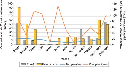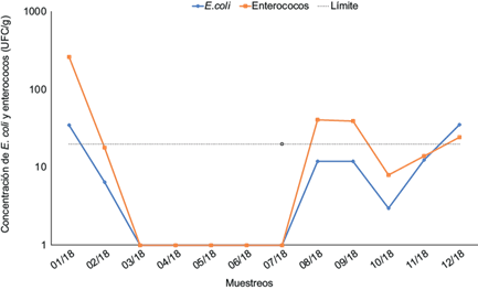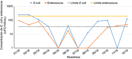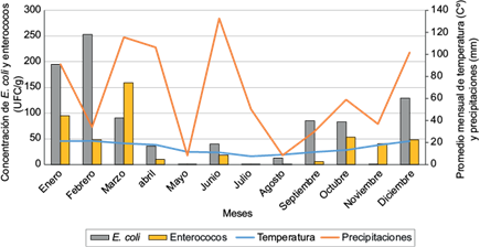 En el agua de mar, al igual que los sitios anteriormente mencionados, el número máximo de UFC se determinó en las colectas realizadas dentro de la temporada alta, aunque los valores de concentración fueron significativamente diferentes entre ambos indicadores, prevaleciendo el número de colonias de EC en comparación a ENT. Asimismo, se identificó la presencia de ENT durante todo el año, pero en menor concentración (Fig. 6).