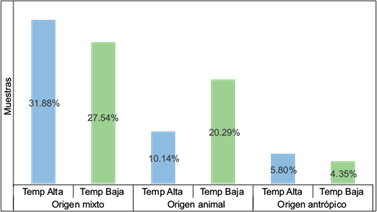 Con respecto al origen de la contaminación fecal según la relación EC/ENT, del total de muestras, el 32 % presentaron contaminación de origen fecal mixta principalmente en la temporada de mayor concurrencia de visitantes, mientras que durante los meses de mayo a noviembre (temporada invernal), se identificó un aumento de la contaminación proveniente de la presencia de animales tanto silvestre como domésticos.