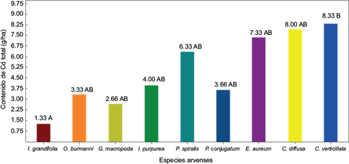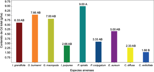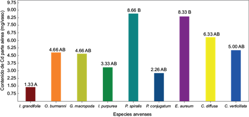 Fig. 8 Comparación de rangos en el contenido de cadmio en parte aérea con base en la prueba de Tukey según especies de arvenses evaluadas para la fitorremediación de suelos contaminados con cadmio. Letras diferentes indican diferencias significativas Tukey (p ≤ 0.05 %).