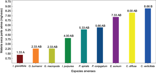 La especie Cissus verticillata tuvo el mayor valor de materia seca en la parte aérea (8.66 mg/vaso), comportamiento similar desde el punto de vista estadístico a Commelina difusa, Epipremnum aurem, Pseudelephantopus spiralis, Paspalum conjugatum, Geophila macropoda y Oplismenus burmannii. Los valores más bajos de materia seca se observaron en Ipomoea grandifolia con un valor de 1.33 mg/vaso (Fig. 2), siendo estadísticamente diferente de Cissus verticillata.