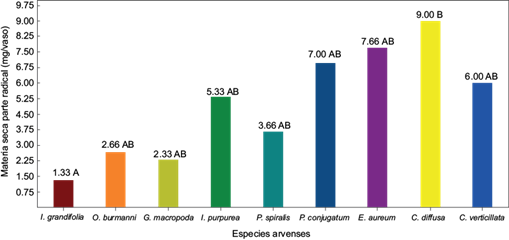 En cuanto a la materia seca radicular Commelina diffusa presentó la mayor producción (9.00 mg/maceta), mientras que Ipomoea grandifolia presentó el menor valor (1.33 mg/maceta), con una diferencia significativa respecto a las demás especies (Fig. 3).