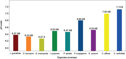 El suelo donde se desarrolló la especie Cissus verticillata presentó el valor más alto de pH (7.13), mientras el suelo que albergó a la especie Geophila macropoda tuvo el más bajo (6.27). Al igual que en los suelos de los otros tratamientos, se podría sugerir que las especies seleccionadas en el estudio generan exudados que lo acidifican y provocan mayor absorción de Cd (Fig. 4).