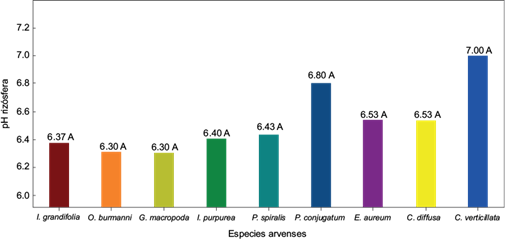 El pH en la rizósfera presentó valores ligeramente inferiores a los reportados en el suelo y, aunque son cercanos a la neutralidad, se evidencia, como se señaló anteriormente, que algunas de las nueve especies evaluadas pueden poseer ciertos mecanismos que permiten la reducción del pH y por tanto pueden favorecer el proceso de absorción. Esto fue demostrado en un estudio realizado por Sun et al. (2019) con la especie Sedum plumbizincicola donde se observó acidificación de la rizósfera provocada por las raíces de esta planta.