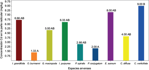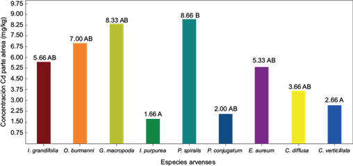 La mayor concentración de Cd en la parte aérea de las plantas se presentó en la especie Pseudelephantopus spiralis (8.66 mg/kg), mientras que las especies Paspalum conjugatum (2.00 mg/kg) y Ipomoea purpurea (1.66 mg/kg) tuvieron la menor concentración, la cual fue significativamente menor al resto de los tratamientos (Fig. 6).