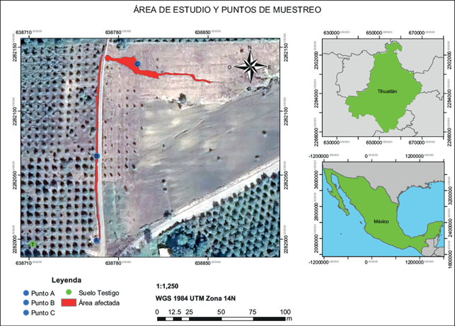 El sitio de estudio se encuentra en la localidad Poza Azul de los Reyes en el municipio de Tihuatlán, Veracruz, México, en las coordenadas 20º37’55.50” N y 97º40’05.34” W, a 127 msnm (Fig. 1) y con una pendiente de vertimiento de 155.56º. La actividad económica principal es la agricultura de naranja (C. sinensis). El clima es cálido y húmedo con lluvias en verano, con una temperatura promedio de 24-26 ºC. El rango de precipitación pluvial es de 1100-1300 mm (CEIEG 2023).