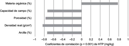 La MO fue el único parámetro que se correlacionó positivamente con la concentración de HTP (p = 0.022), un resultado común en determinaciones de este tipo, ya que la determinación se realiza al medir el carbono oxidable del suelo.