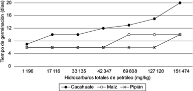 Fig. 3 Tiempo de germinación en días de las semillas de cacahuate, maíz y pipián en suelo contaminado con hidrocarburos de petróleo en distintas concentraciones (ensayo ex situ).