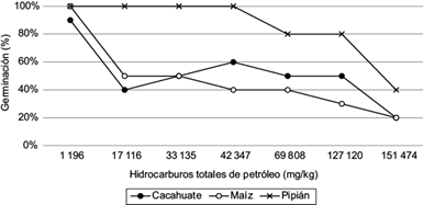 El porcentaje de germinación de los tres cultivos tuvo un comportamiento similar (Fig. 4), ya que disminuyó por las altas concentraciones del contaminante en los tres cultivos (p < 0.001). El pipián fue el menos afectado (p < 0.001) en comparación con el maíz y el cacahuate, no así para el segundo punto de concentración de HTP, donde se observó alrededor del 50 % de germinación en 10 días.
