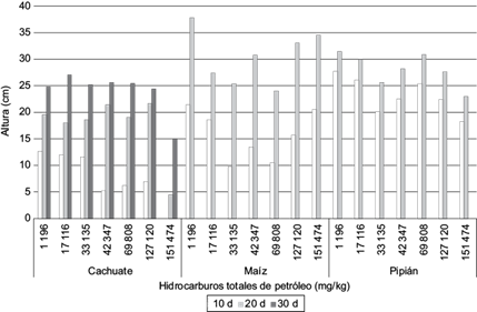 Se determinó también la altura de las plantas (Fig. 5), encontrándose que a los 10 días aquellas que fueron cultivadas en suelos con menor concentración de HTP alcanzaron mayor altura en comparación con las que crecieron en suelo contaminado (p < 0.001) y 20 días (p < 0.001), en los tres cultivos. El cacahuate fue el único cultivo que se mantuvo viable hasta el día 30; aunque las altas concentraciones del contaminante afectaron su altura máxima, presentó crecimiento constante en todos los suelos (p > 0.05).