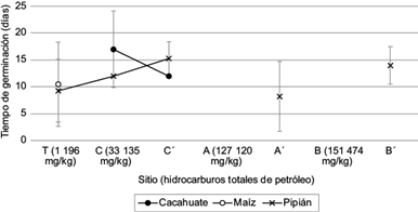 Fig. 6 Tiempo de germinación en días para las semillas de cacahuate, maíz y pipián en el sitio contaminado con hidrocarburos en los distintos puntos muestreados. T: suelo testigo; A: suelo contaminado en el punto A; B: suelo contaminado en el punto B, y C: suelo contaminado en el punto C. Los sitios marcados con comilla (e.g., A’) indican la siembra realizada en una línea a 30 cm del punto original.